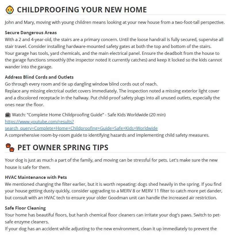 This is a real sample guide — built from an actual inspection report for a first-time homebuying family with two young children and a dog