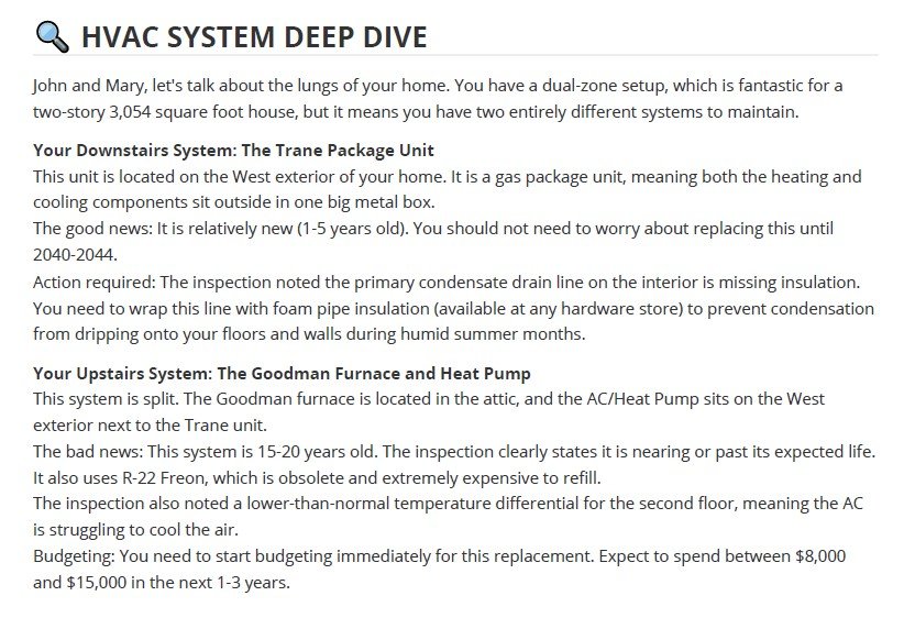 Systems are referenced by brand, age, and condition — not generic advice. Your clients will know exactly what they own and when to replace it.