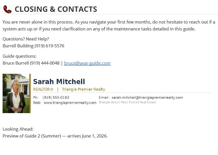 A2: The first guide (Week 1 Essentials + their first seasonal guide) is delivered 30 days after closing. Then quarterly guides arrive at 120, 210, and 300 days after closing—perfectly timed with the seasons.