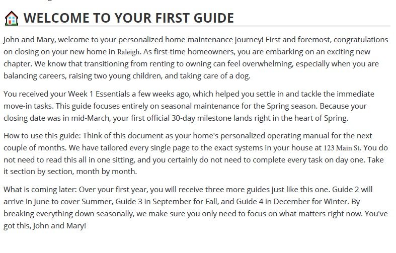 Guides arrive at the right time: Week 1 essentials when they move in, then seasonal guides aligned with when maintenance should actually be performed.